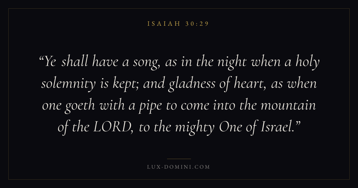 Ye shall have a song, as in the night when a holy solemnity is kept; and gladness of heart, as when one goeth with a pipe to come into the mountain of the LORD, to the mighty One of Israel.