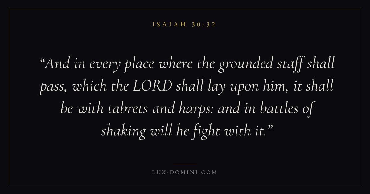 And in every place where the grounded staff shall pass, which the LORD shall lay upon him, it shall be with tabrets and harps: and in battles of shaking will he fight with it.
