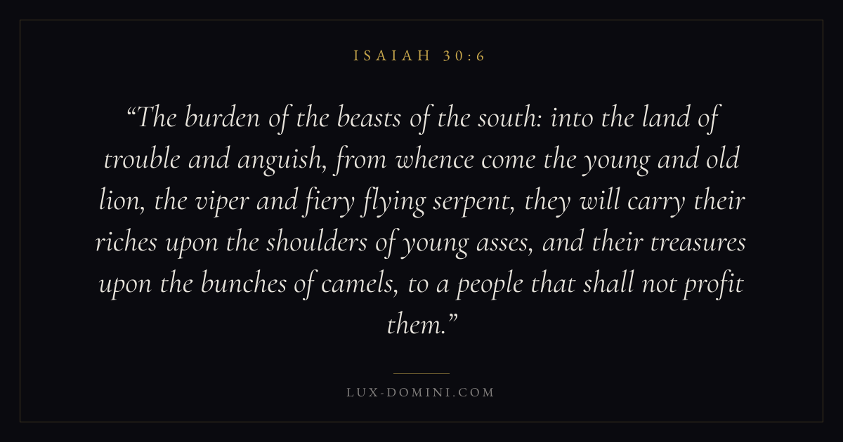 The burden of the beasts of the south: into the land of trouble and anguish, from whence come the young and old lion, the viper and fiery flying serpent, they will carry their riches upon the shoulders of young asses, and their treasures upon the bunches of camels, to a people that shall not profit them.