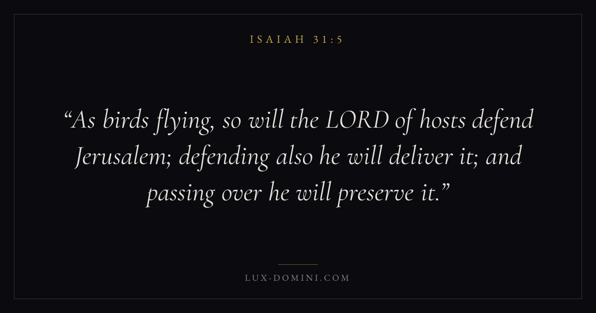 As birds flying, so will the LORD of hosts defend Jerusalem; defending also he will deliver it; and passing over he will preserve it.