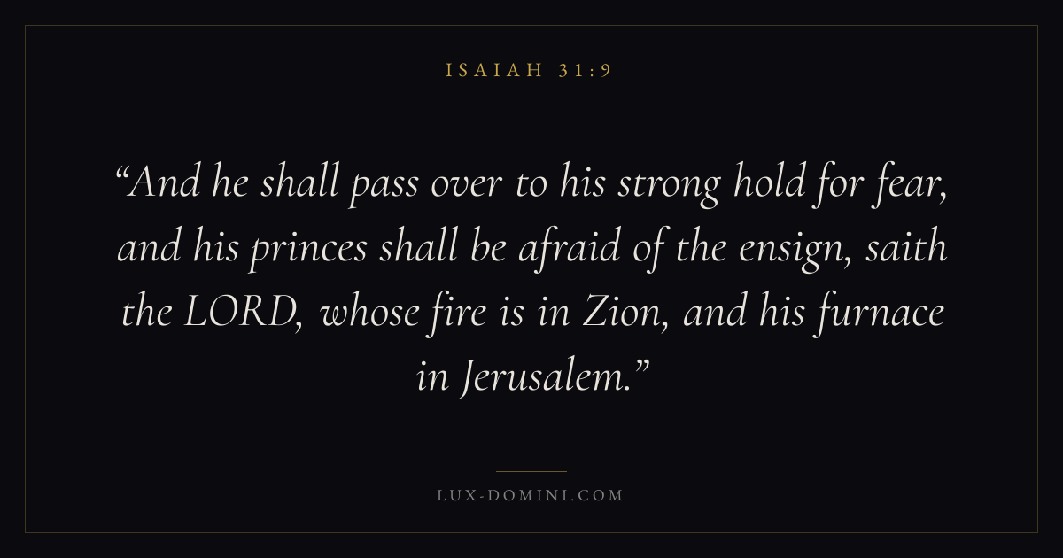 And he shall pass over to his strong hold for fear, and his princes shall be afraid of the ensign, saith the LORD, whose fire is in Zion, and his furnace in Jerusalem.