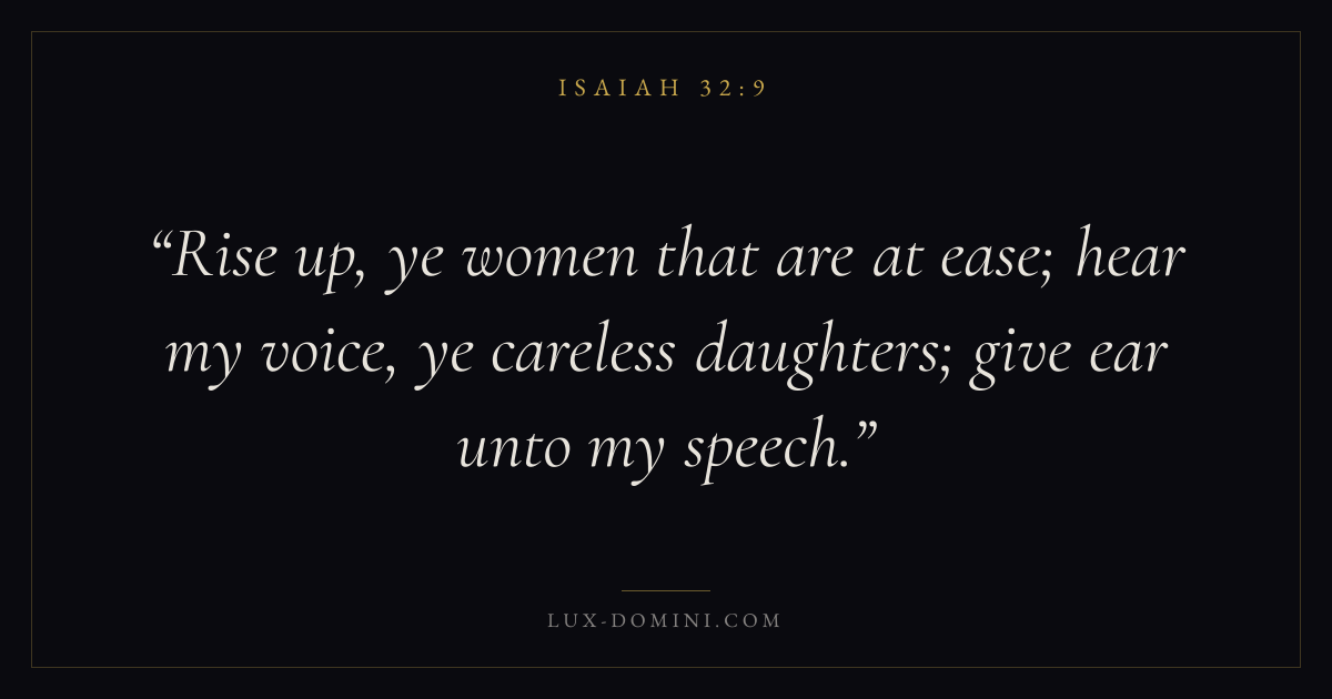 Rise up, ye women that are at ease; hear my voice, ye careless daughters; give ear unto my speech.