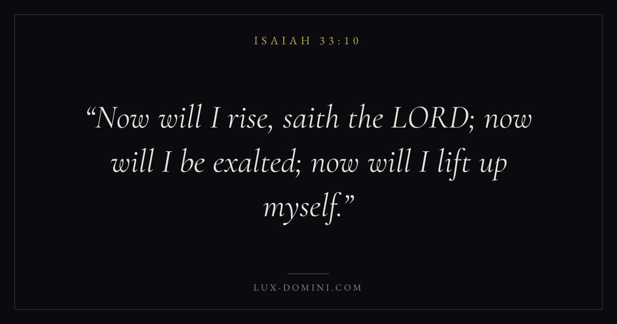 Books / Isaiah / Chapter 33 / Verse 10 ← Isaiah 33:9 Isaiah 33:10 Isaiah 33:11 → Now will I rise, saith the LORD; now will I be exalted; now will I lift up myself. Download verse card Share on Twitter Share on Facebook Pin it ✦ Key themes Justice and mercyHumilityHolinessJudgment Read with Isaiah 33:9Micah 6:8Amos 5:24Philippians 2:3 Related topics Bible verses about justice and mercyBible verses about humility ✦ Isaiah Chapter 33 verses V. 1 V. 2 V. 3 V. 4 V. 5 V. 6 V. 7 V. 8 V. 9 V. 10 V. 11 V. 12 V. 13 V. 14 V. 15 V. 16 V. 17 V. 18 V. 19 V. 20 V. 21 V. 22 V. 23 V. 24