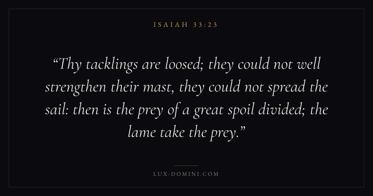 Thy tacklings are loosed; they could not well strengthen their mast, they could not spread the sail: then is the prey of a great spoil divided; the lame take the prey.