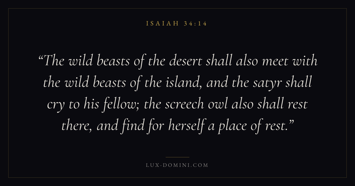 The wild beasts of the desert shall also meet with the wild beasts of the island, and the satyr shall cry to his fellow; the screech owl also shall rest there, and find for herself a place of rest.