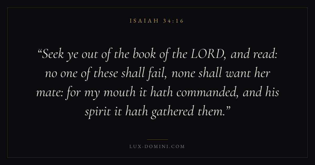Seek ye out of the book of the LORD, and read: no one of these shall fail, none shall want her mate: for my mouth it hath commanded, and his spirit it hath gathered them.