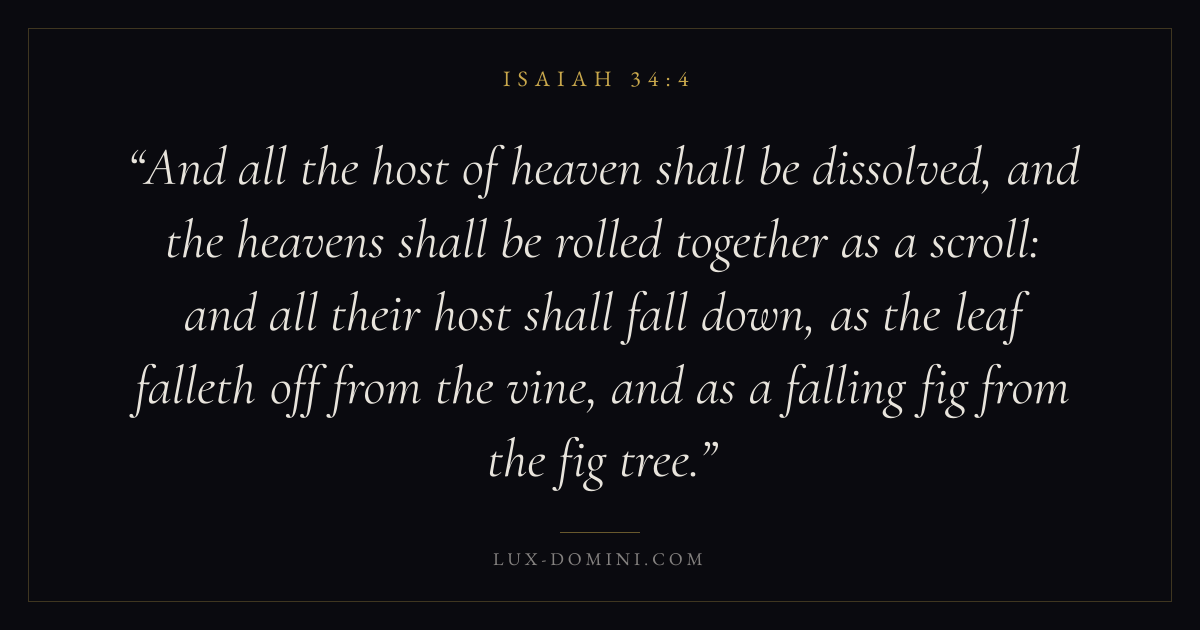 And all the host of heaven shall be dissolved, and the heavens shall be rolled together as a scroll: and all their host shall fall down, as the leaf falleth off from the vine, and as a falling fig from the fig tree.