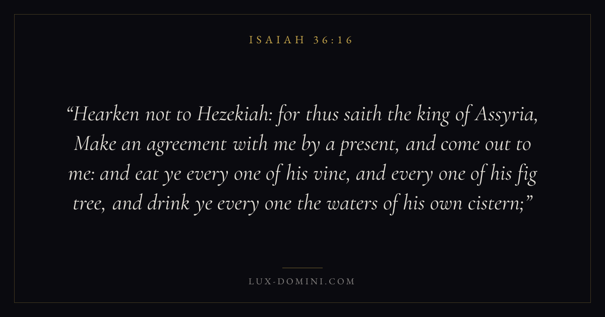 Hearken not to Hezekiah: for thus saith the king of Assyria, Make an agreement with me by a present, and come out to me: and eat ye every one of his vine, and every one of his fig tree, and drink ye every one the waters of his own cistern;