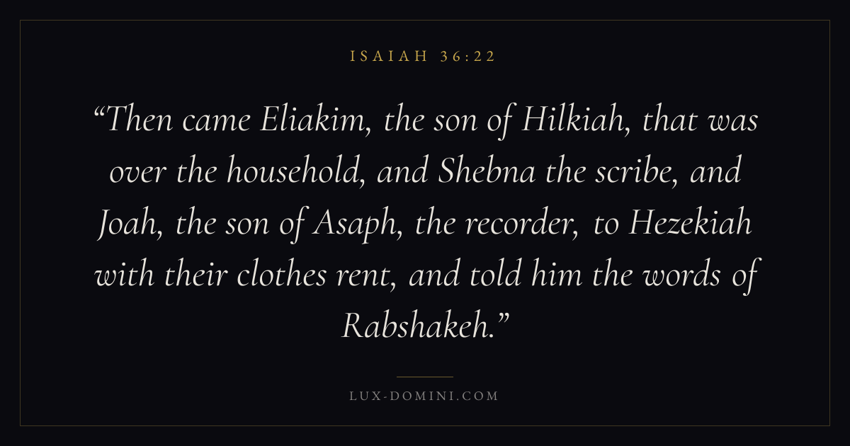 Then came Eliakim, the son of Hilkiah, that was over the household, and Shebna the scribe, and Joah, the son of Asaph, the recorder, to Hezekiah with their clothes rent, and told him the words of Rabshakeh.