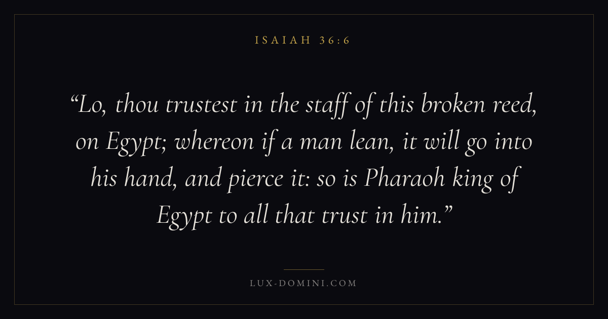 Lo, thou trustest in the staff of this broken reed, on Egypt; whereon if a man lean, it will go into his hand, and pierce it: so is Pharaoh king of Egypt to all that trust in him.