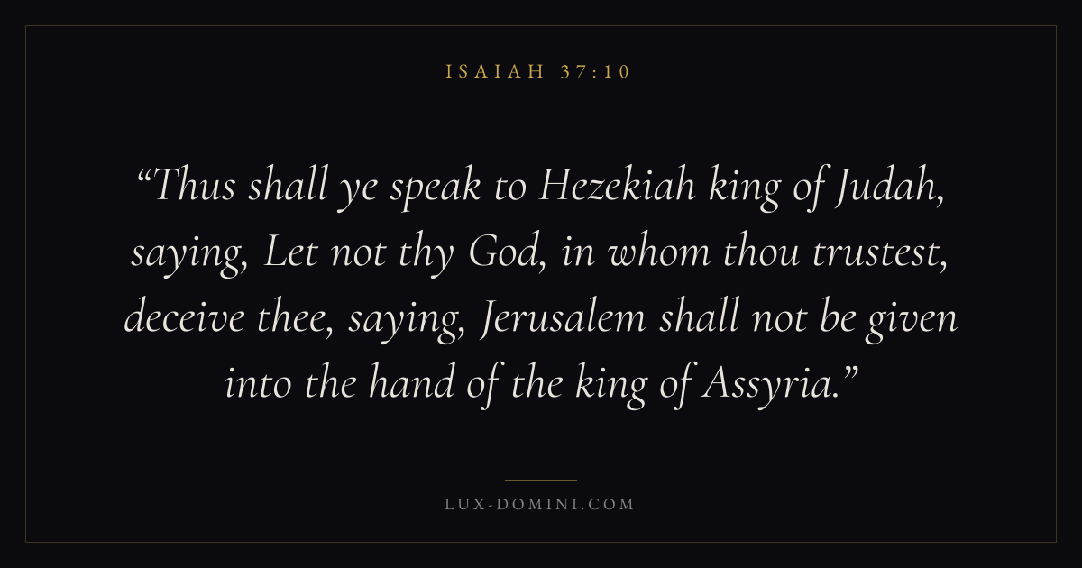 Thus shall ye speak to Hezekiah king of Judah, saying, Let not thy God, in whom thou trustest, deceive thee, saying, Jerusalem shall not be given into the hand of the king of Assyria.