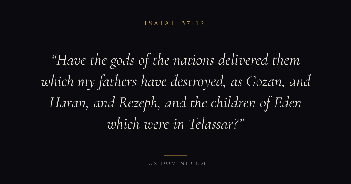 Have the gods of the nations delivered them which my fathers have destroyed, as Gozan, and Haran, and Rezeph, and the children of Eden which were in Telassar?