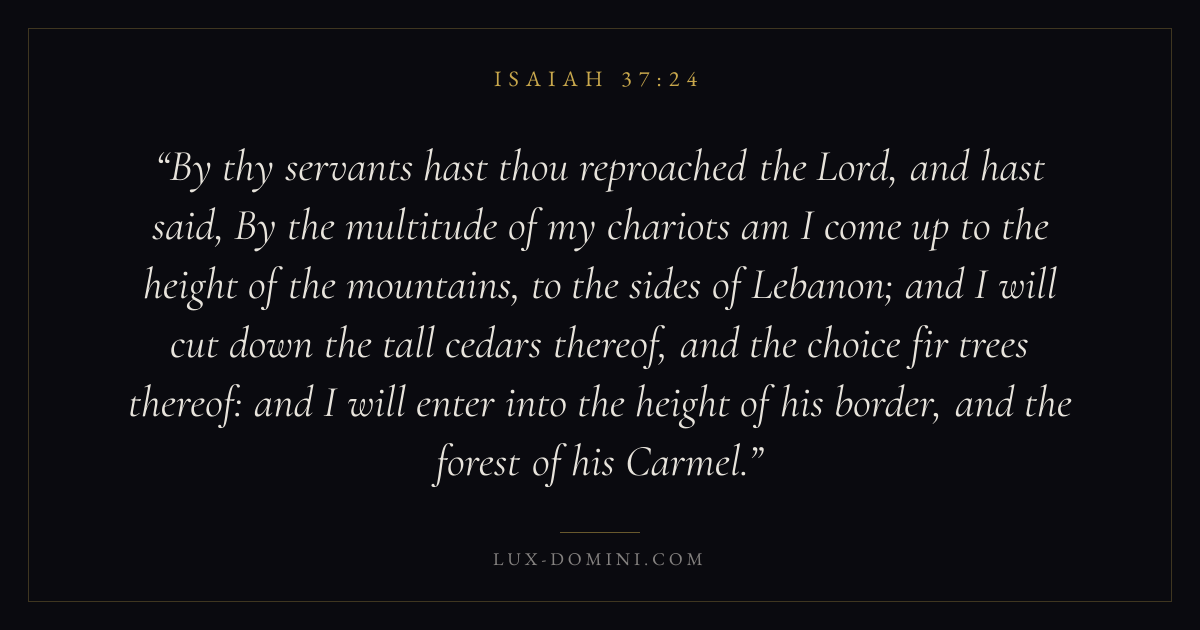 By thy servants hast thou reproached the Lord, and hast said, By the multitude of my chariots am I come up to the height of the mountains, to the sides of Lebanon; and I will cut down the tall cedars thereof, and the choice fir trees thereof: and I will enter into the height of his border, and the forest of his Carmel.