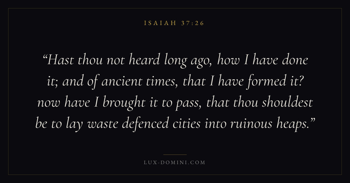 Hast thou not heard long ago, how I have done it; and of ancient times, that I have formed it? now have I brought it to pass, that thou shouldest be to lay waste defenced cities into ruinous heaps.