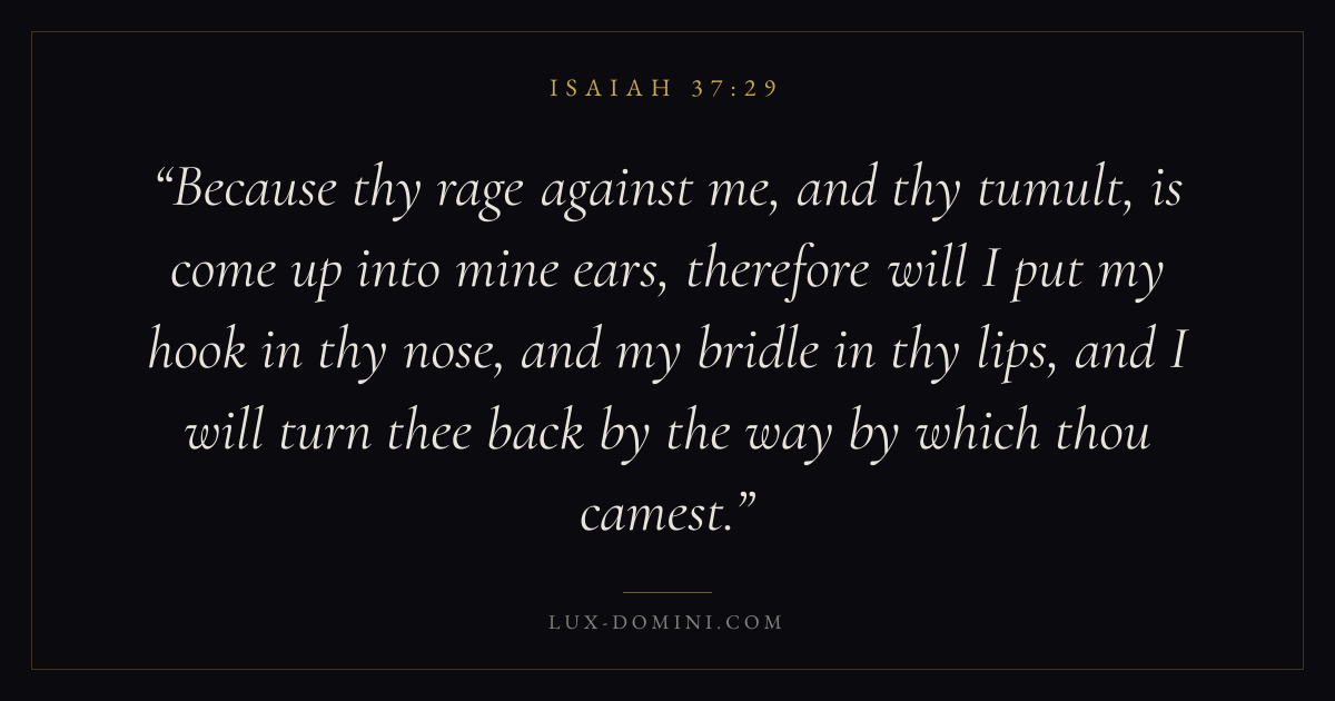 Because thy rage against me, and thy tumult, is come up into mine ears, therefore will I put my hook in thy nose, and my bridle in thy lips, and I will turn thee back by the way by which thou camest.