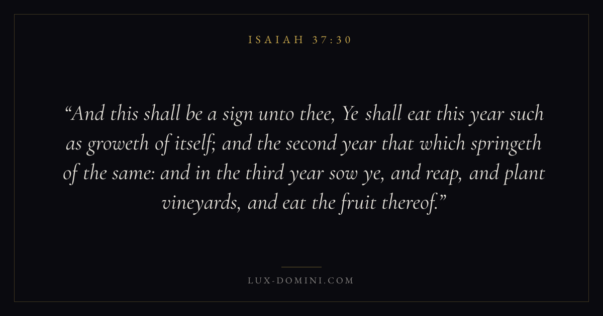 And this shall be a sign unto thee, Ye shall eat this year such as groweth of itself; and the second year that which springeth of the same: and in the third year sow ye, and reap, and plant vineyards, and eat the fruit thereof.
