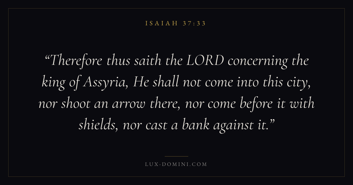 Therefore thus saith the LORD concerning the king of Assyria, He shall not come into this city, nor shoot an arrow there, nor come before it with shields, nor cast a bank against it.