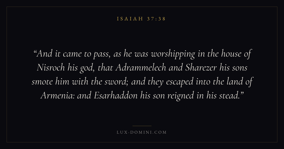 And it came to pass, as he was worshipping in the house of Nisroch his god, that Adrammelech and Sharezer his sons smote him with the sword; and they escaped into the land of Armenia: and Esarhaddon his son reigned in his stead.