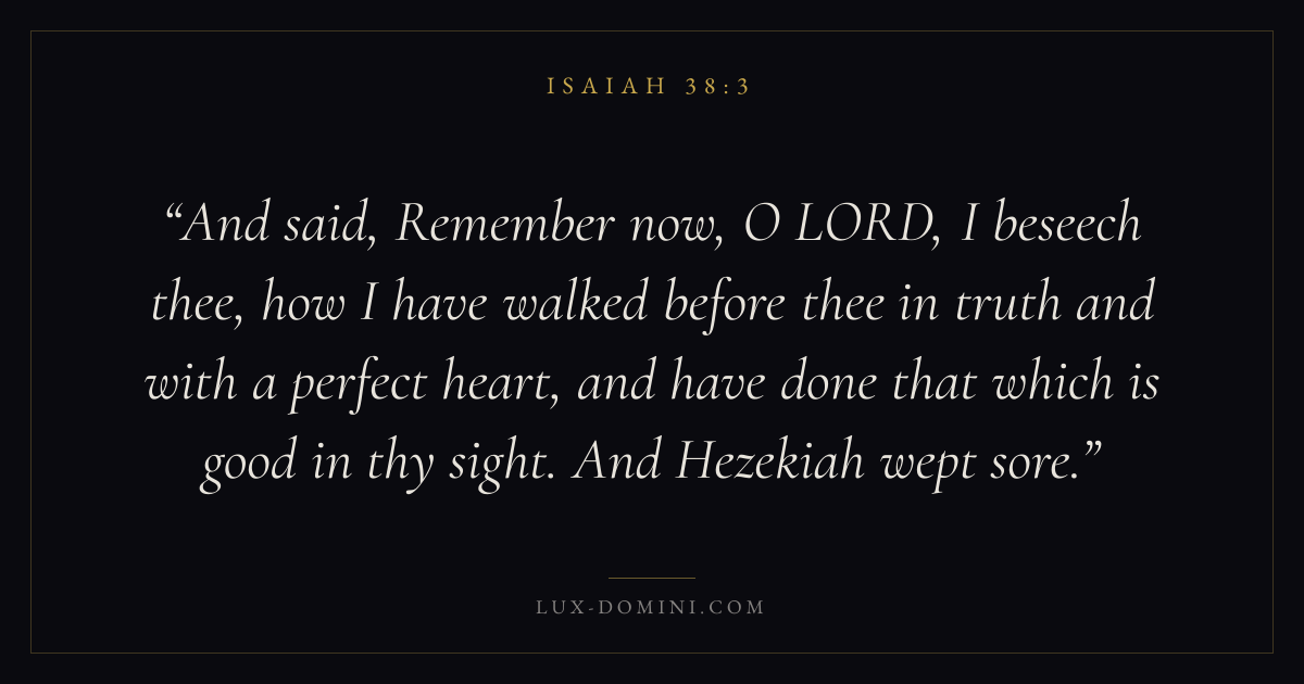 And said, Remember now, O LORD, I beseech thee, how I have walked before thee in truth and with a perfect heart, and have done that which is good in thy sight. And Hezekiah wept sore.
