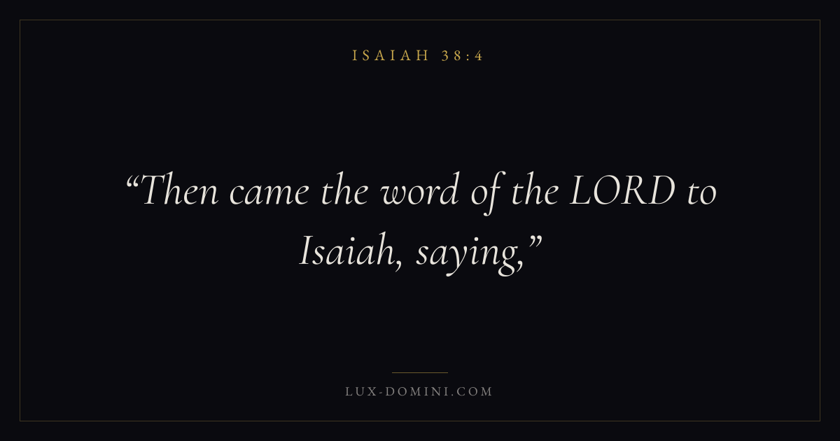 Books / Isaiah / Chapter 38 / Verse 4 ← Isaiah 38:3 Isaiah 38:4 Isaiah 38:5 → Then came the word of the LORD to Isaiah, saying, Download verse card Share on Twitter Share on Facebook Pin it ✦ Key themes PrayerJustice and mercyForgivenessTruthHoliness Read with Isaiah 38:5Isaiah 38:6Matthew 6:9Luke 18:1 Related topics Bible verses about prayerBible verses about justice and mercyBible verses about forgivenessBible verses about truth Glossary Isaiah Person (Heb. Yesh’yahu, i. e., “the salvation of Jehovah”). (1. ) The son of Amoz ( Isa. 1:1 ; 2:1 ), who was apparently a man of humble rank. ✦ Isaiah Chapter 38 verses V. 1 V. 2 V. 3 V. 4 V. 5 V. 6 V. 7 V. 8 V. 9 V. 10 V. 11 V. 12 V. 13 V. 14 V. 15 V. 16 V. 17 V. 18 V. 19 V. 20 V. 21 V. 22