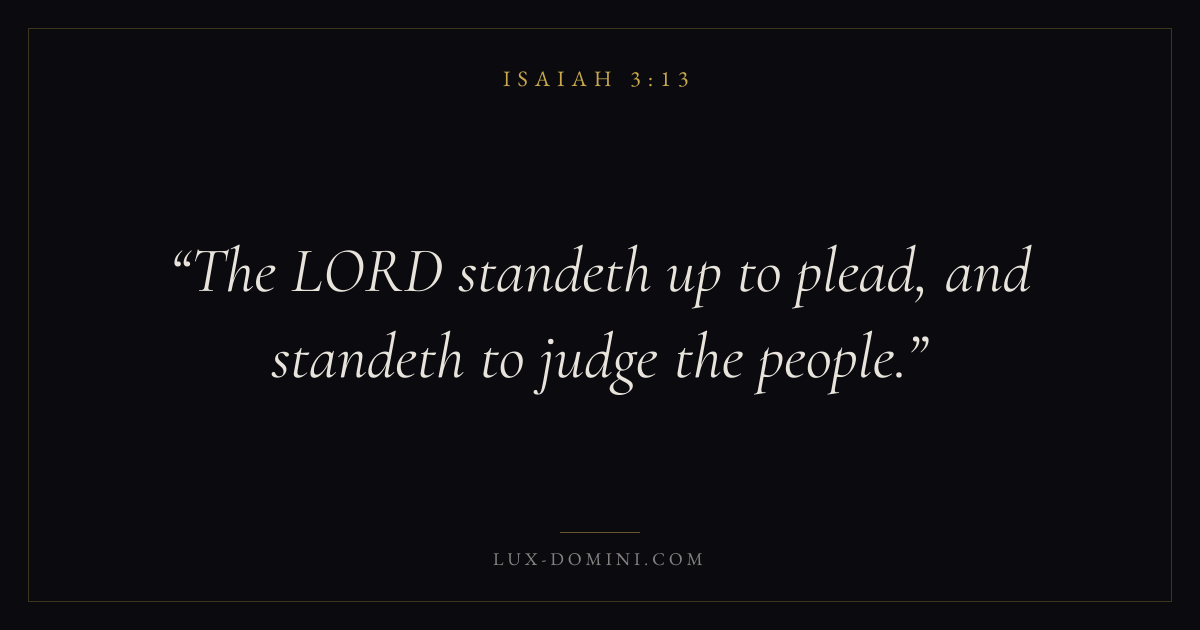 Books / Isaiah / Chapter 3 / Verse 13 ← Isaiah 3:12 Isaiah 3:13 Isaiah 3:14 → The LORD standeth up to plead, and standeth to judge the people. Download verse card Share on Twitter Share on Facebook Pin it ✦ Key themes FaithJustice and mercyHolinessJudgment Read with Isaiah 3:12Isaiah 3:14Hebrews 11:1Romans 10:17 Related topics Bible verses about faithBible verses about justice and mercy ✦ Isaiah Chapter 3 verses V. 1 V. 2 V. 3 V. 4 V. 5 V. 6 V. 7 V. 8 V. 9 V. 10 V. 11 V. 12 V. 13 V. 14 V. 15 V. 16 V. 17 V. 18 V. 19 V. 20 V. 21 V. 22 V. 23 V. 24 V. 25 V. 26