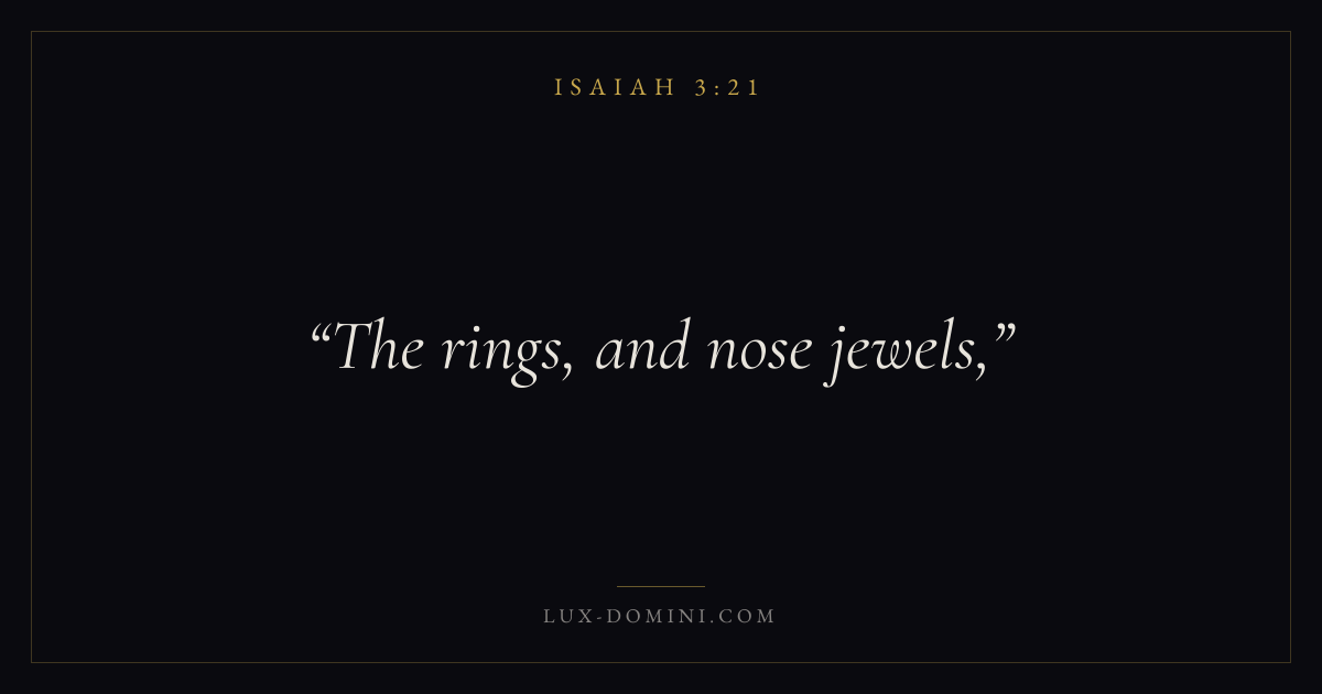 Books / Isaiah / Chapter 3 / Verse 21 ← Isaiah 3:20 Isaiah 3:21 Isaiah 3:22 → The rings, and nose jewels, Download verse card Share on Twitter Share on Facebook Pin it ✦ Key themes Justice and mercyHumilityHolinessJudgment Read with Isaiah 3:18Isaiah 3:19Micah 6:8Amos 5:24 Related topics Bible verses about justice and mercyBible verses about humility ✦ Isaiah Chapter 3 verses V. 1 V. 2 V. 3 V. 4 V. 5 V. 6 V. 7 V. 8 V. 9 V. 10 V. 11 V. 12 V. 13 V. 14 V. 15 V. 16 V. 17 V. 18 V. 19 V. 20 V. 21 V. 22 V. 23 V. 24 V. 25 V. 26