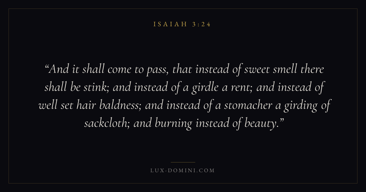And it shall come to pass, that instead of sweet smell there shall be stink; and instead of a girdle a rent; and instead of well set hair baldness; and instead of a stomacher a girding of sackcloth; and burning instead of beauty.