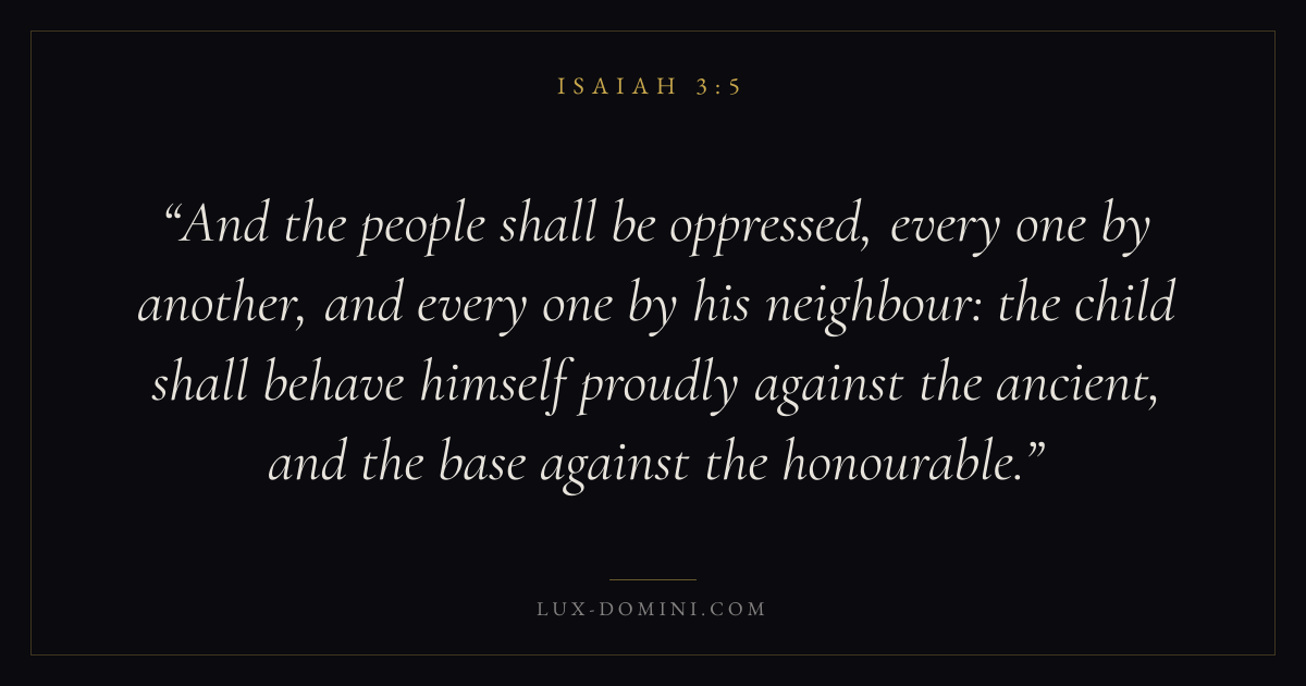 And the people shall be oppressed, every one by another, and every one by his neighbour: the child shall behave himself proudly against the ancient, and the base against the honourable.