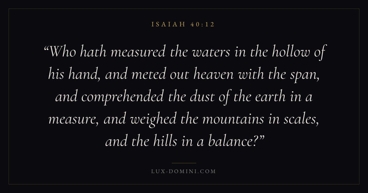 Who hath measured the waters in the hollow of his hand, and meted out heaven with the span, and comprehended the dust of the earth in a measure, and weighed the mountains in scales, and the hills in a balance?