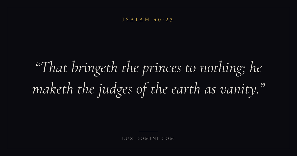 Books / Isaiah / Chapter 40 / Verse 23 ← Isaiah 40:22 Isaiah 40:23 Isaiah 40:24 → That bringeth the princes to nothing; he maketh the judges of the earth as vanity. Download verse card Share on Twitter Share on Facebook Pin it ✦ Key themes LoveHopeAnxiety and fearJustice and mercyHoliness Read with Isaiah 40:22John 3:161 Corinthians 13:4Romans 8:24 Related topics Bible verses about loveBible verses about hopeBible verses about anxiety and fearBible verses about justice and mercy ✦ Isaiah Chapter 40 verses V. 1 V. 2 V. 3 V. 4 V. 5 V. 6 V. 7 V. 8 V. 9 V. 10 V. 11 V. 12 V. 13 V. 14 V. 15 V. 16 V. 17 V. 18 V. 19 V. 20 V. 21 V. 22 V. 23 V. 24 V. 25 V. 26 V. 27 V. 28 V. 29 V. 30 V. 31
