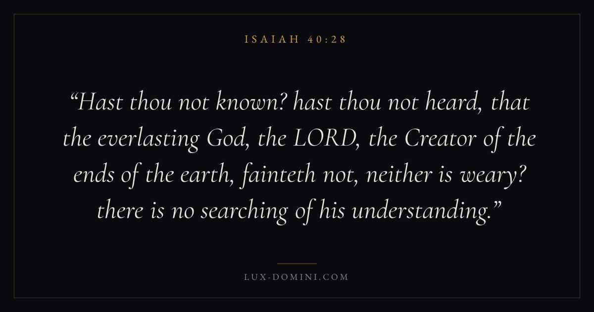 Hast thou not known? hast thou not heard, that the everlasting God, the LORD, the Creator of the ends of the earth, fainteth not, neither is weary? there is no searching of his understanding.