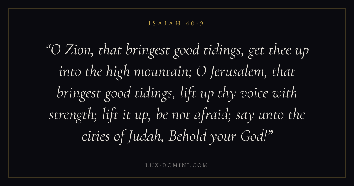 O Zion, that bringest good tidings, get thee up into the high mountain; O Jerusalem, that bringest good tidings, lift up thy voice with strength; lift it up, be not afraid; say unto the cities of Judah, Behold your God!