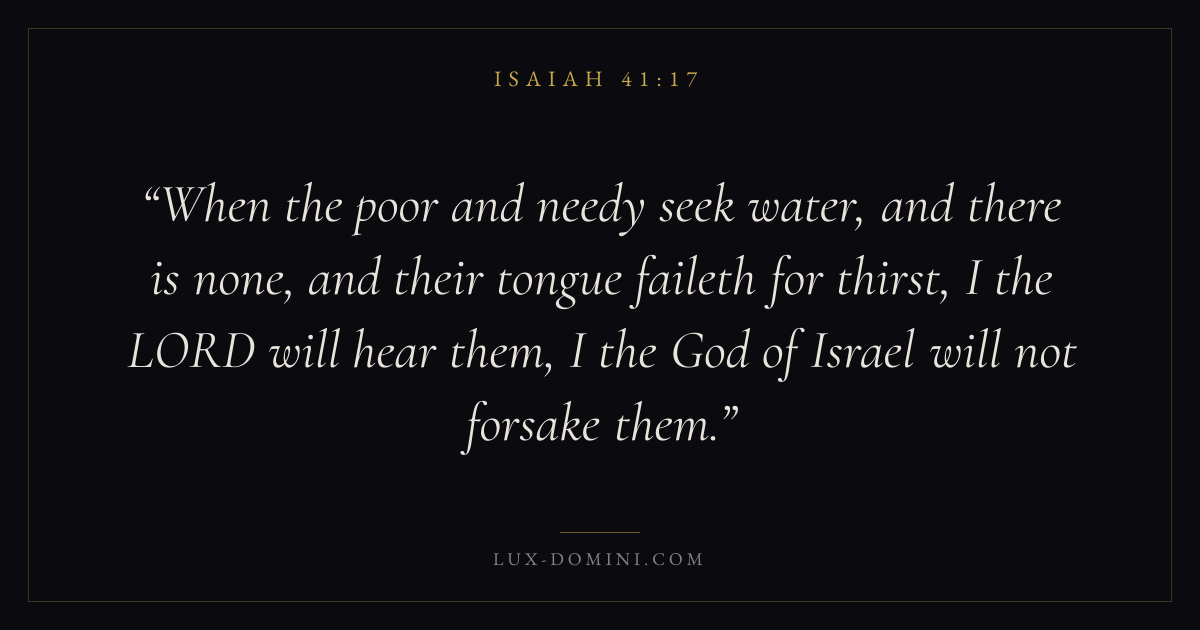 When the poor and needy seek water, and there is none, and their tongue faileth for thirst, I the LORD will hear them, I the God of Israel will not forsake them.
