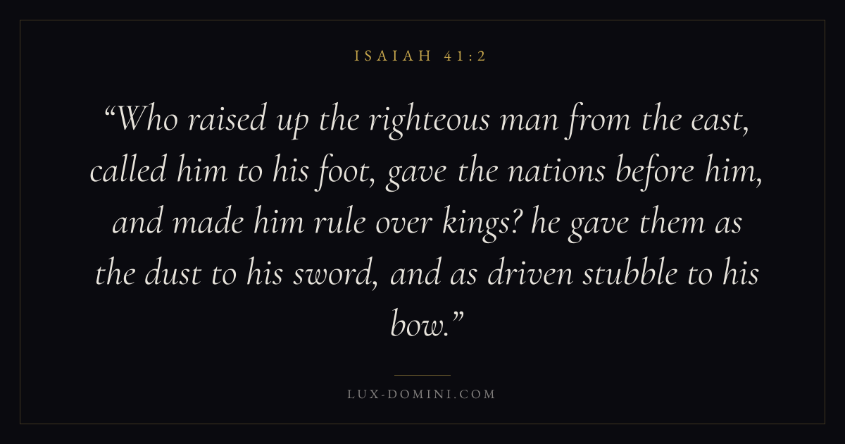 Who raised up the righteous man from the east, called him to his foot, gave the nations before him, and made him rule over kings? he gave them as the dust to his sword, and as driven stubble to his bow.