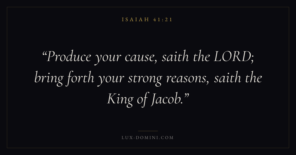Produce your cause, saith the LORD; bring forth your strong reasons, saith the King of Jacob.