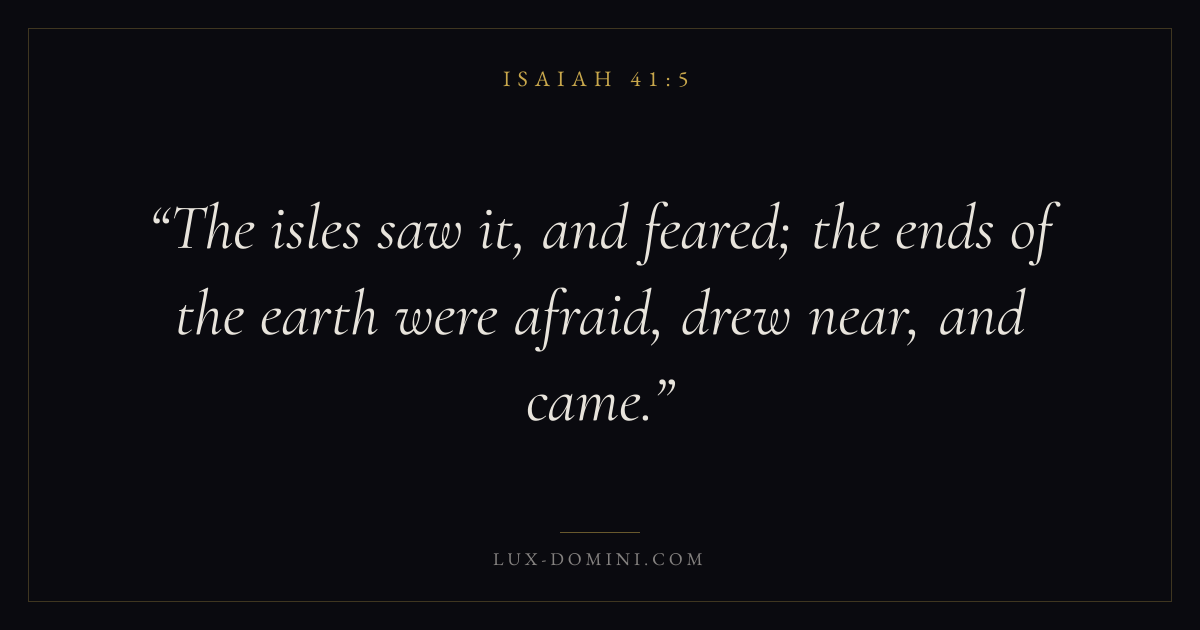 Books / Isaiah / Chapter 41 / Verse 5 ← Isaiah 41:4 Isaiah 41:5 Isaiah 41:6 → The isles saw it, and feared; the ends of the earth were afraid, drew near, and came. Download verse card Share on Twitter Share on Facebook Pin it ✦ Key themes Anxiety and fearJustice and mercyHolinessJudgment Read with Isaiah 41:3Isaiah 41:4Philippians 4:6Isaiah 41:10 Related topics Bible verses about anxiety and fearBible verses about justice and mercy ✦ Isaiah Chapter 41 verses V. 1 V. 2 V. 3 V. 4 V. 5 V. 6 V. 7 V. 8 V. 9 V. 10 V. 11 V. 12 V. 13 V. 14 V. 15 V. 16 V. 17 V. 18 V. 19 V. 20 V. 21 V. 22 V. 23 V. 24 V. 25 V. 26 V. 27 V. 28 V. 29