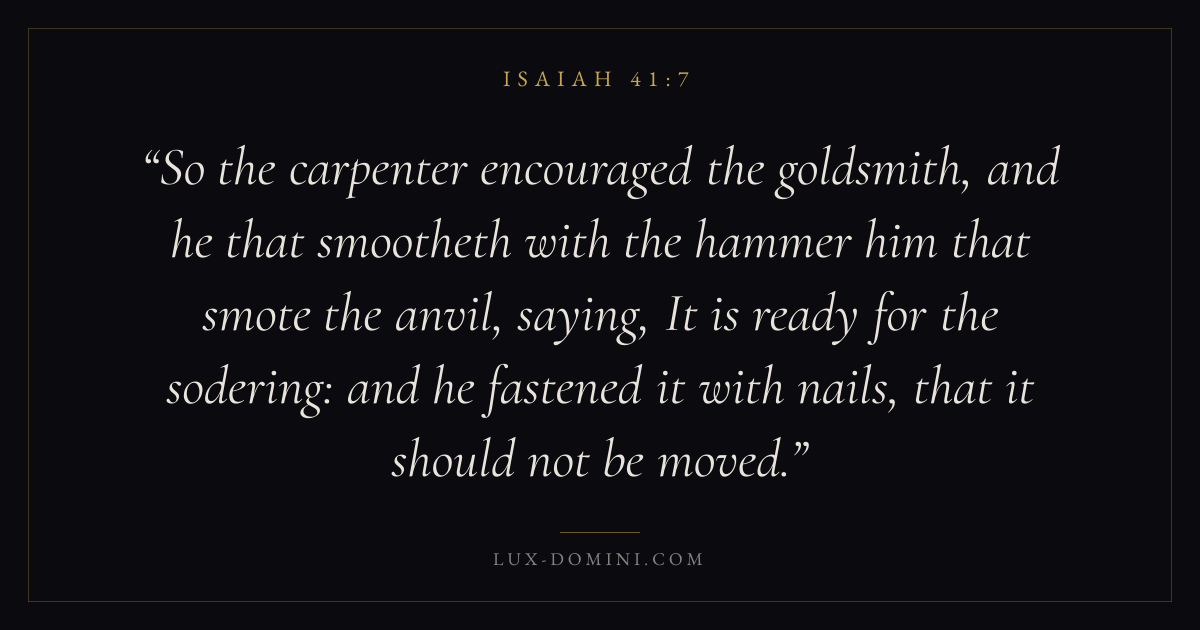So the carpenter encouraged the goldsmith, and he that smootheth with the hammer him that smote the anvil, saying, It is ready for the sodering: and he fastened it with nails, that it should not be moved.