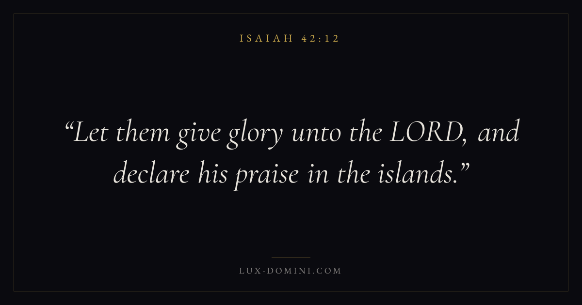 Books / Isaiah / Chapter 42 / Verse 12 ← Isaiah 42:11 Isaiah 42:12 Isaiah 42:13 → Let them give glory unto the LORD, and declare his praise in the islands. Download verse card Share on Twitter Share on Facebook Pin it ✦ Key themes Justice and mercyHolinessJudgmentRemnant Read with Isaiah 42:10Isaiah 42:11Micah 6:8Amos 5:24 Related topics Bible verses about justice and mercy ✦ Isaiah Chapter 42 verses V. 1 V. 2 V. 3 V. 4 V. 5 V. 6 V. 7 V. 8 V. 9 V. 10 V. 11 V. 12 V. 13 V. 14 V. 15 V. 16 V. 17 V. 18 V. 19 V. 20 V. 21 V. 22 V. 23 V. 24 V. 25