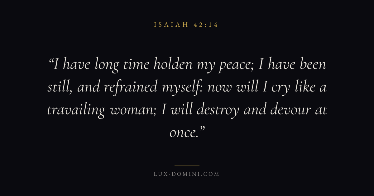 I have long time holden my peace; I have been still, and refrained myself: now will I cry like a travailing woman; I will destroy and devour at once.