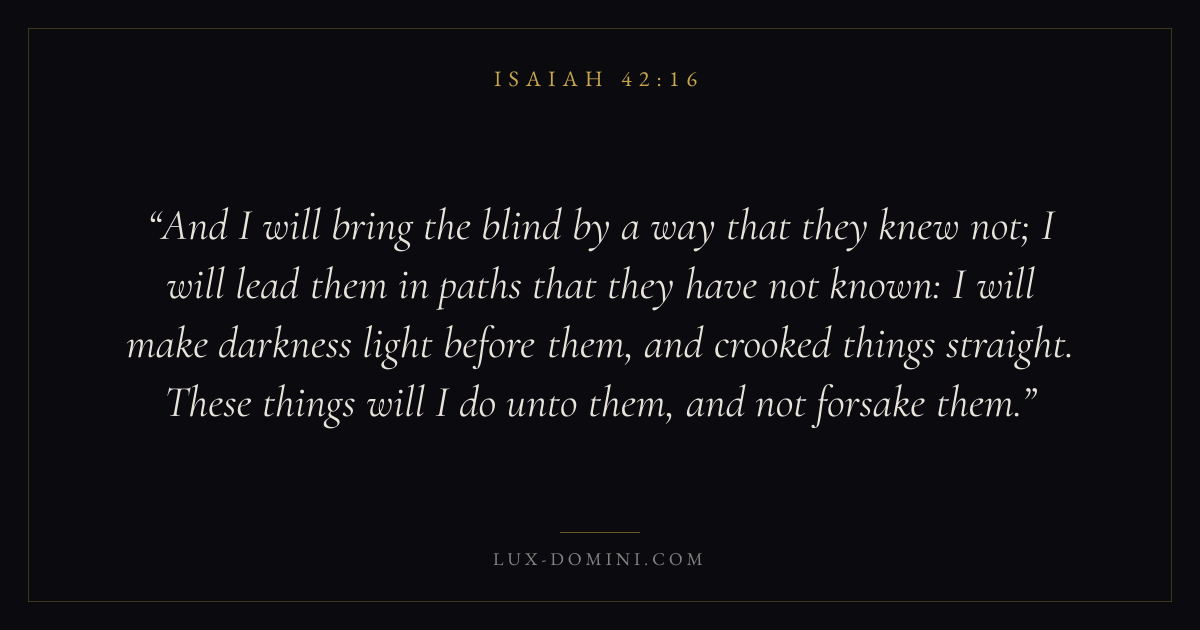 And I will bring the blind by a way that they knew not; I will lead them in paths that they have not known: I will make darkness light before them, and crooked things straight. These things will I do unto them, and not forsake them.