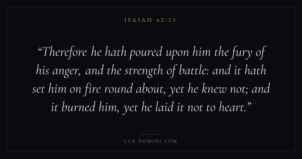 Therefore he hath poured upon him the fury of his anger, and the strength of battle: and it hath set him on fire round about, yet he knew not; and it burned him, yet he laid it not to heart.