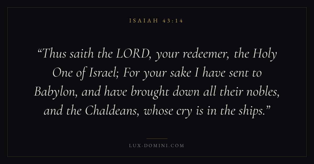 Thus saith the LORD, your redeemer, the Holy One of Israel; For your sake I have sent to Babylon, and have brought down all their nobles, and the Chaldeans, whose cry is in the ships.