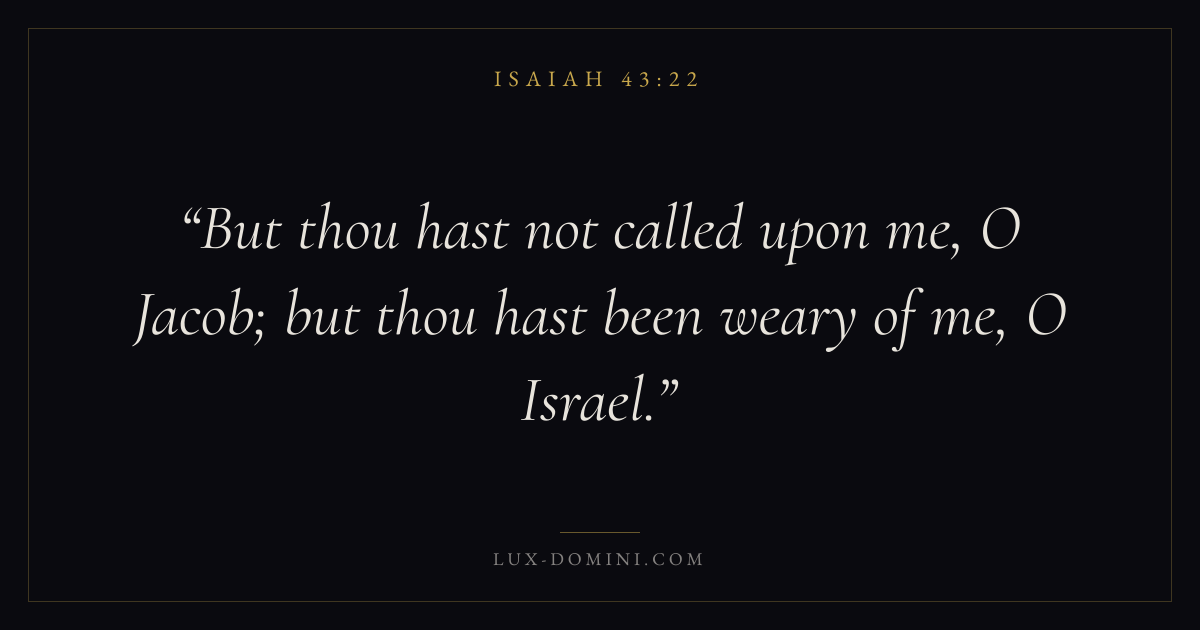 Books / Isaiah / Chapter 43 / Verse 22 ← Isaiah 43:21 Isaiah 43:22 Isaiah 43:23 → But thou hast not called upon me, O Jacob; but thou hast been weary of me, O Israel. Download verse card Share on Twitter Share on Facebook Pin it ✦ Key themes PrayerJustice and mercyHolinessJudgment Read with Isaiah 43:23Matthew 6:9Luke 18:1Micah 6:8 Related topics Bible verses about prayerBible verses about justice and mercy ✦ Isaiah Chapter 43 verses V. 1 V. 2 V. 3 V. 4 V. 5 V. 6 V. 7 V. 8 V. 9 V. 10 V. 11 V. 12 V. 13 V. 14 V. 15 V. 16 V. 17 V. 18 V. 19 V. 20 V. 21 V. 22 V. 23 V. 24 V. 25 V. 26 V. 27 V. 28