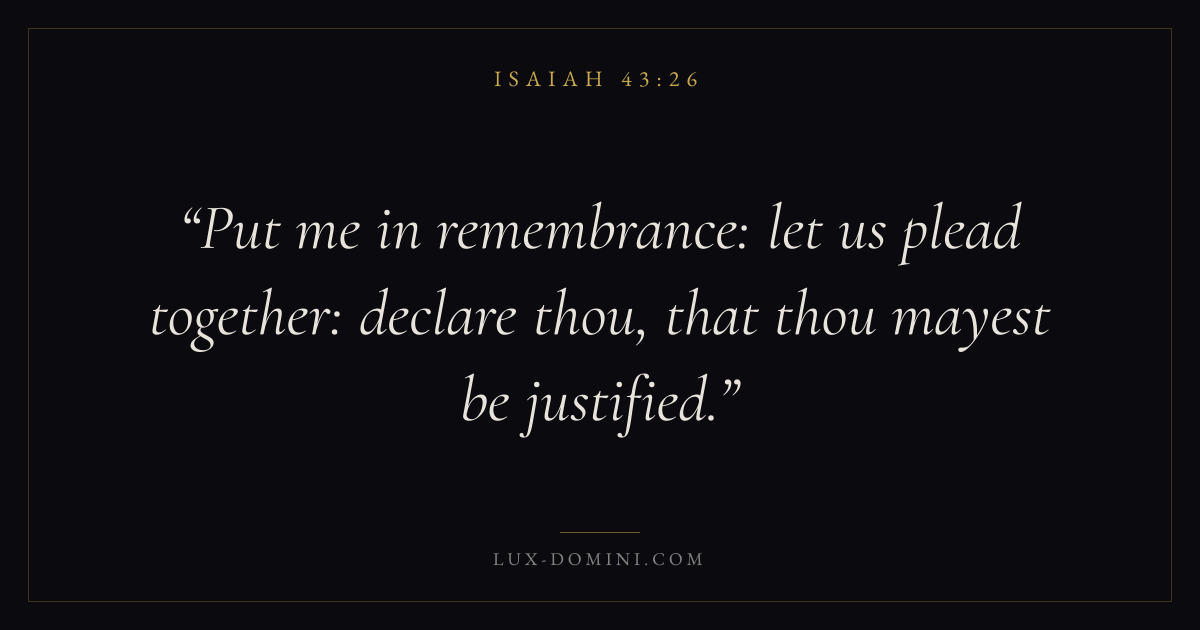 Books / Isaiah / Chapter 43 / Verse 26 ← Isaiah 43:25 Isaiah 43:26 Isaiah 43:27 → Put me in remembrance: let us plead together: declare thou, that thou mayest be justified. Download verse card Share on Twitter Share on Facebook Pin it ✦ Key themes PrayerJustice and mercyHolinessJudgment Read with Isaiah 43:24Isaiah 43:25Matthew 6:9Luke 18:1 Related topics Bible verses about prayerBible verses about justice and mercy ✦ Isaiah Chapter 43 verses V. 1 V. 2 V. 3 V. 4 V. 5 V. 6 V. 7 V. 8 V. 9 V. 10 V. 11 V. 12 V. 13 V. 14 V. 15 V. 16 V. 17 V. 18 V. 19 V. 20 V. 21 V. 22 V. 23 V. 24 V. 25 V. 26 V. 27 V. 28