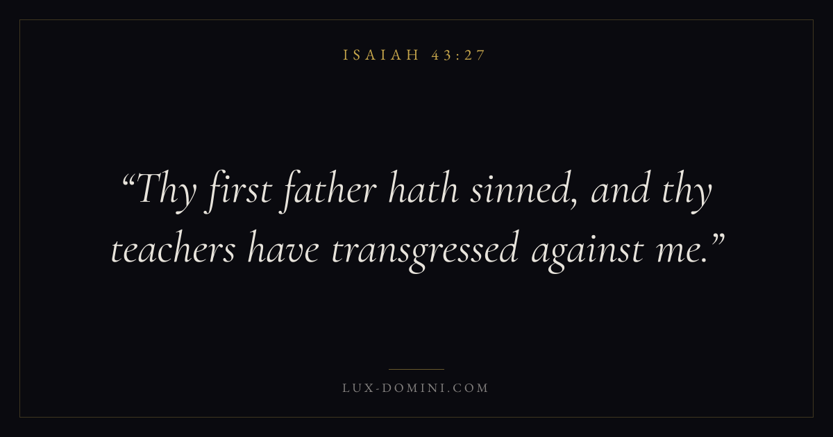 Books / Isaiah / Chapter 43 / Verse 27 ← Isaiah 43:26 Isaiah 43:27 Isaiah 43:28 → Thy first father hath sinned, and thy teachers have transgressed against me. Download verse card Share on Twitter Share on Facebook Pin it ✦ Key themes PrayerJustice and mercyHolinessJudgment Read with Isaiah 43:28Matthew 6:9Luke 18:1Micah 6:8 Related topics Bible verses about prayerBible verses about justice and mercy ✦ Isaiah Chapter 43 verses V. 1 V. 2 V. 3 V. 4 V. 5 V. 6 V. 7 V. 8 V. 9 V. 10 V. 11 V. 12 V. 13 V. 14 V. 15 V. 16 V. 17 V. 18 V. 19 V. 20 V. 21 V. 22 V. 23 V. 24 V. 25 V. 26 V. 27 V. 28
