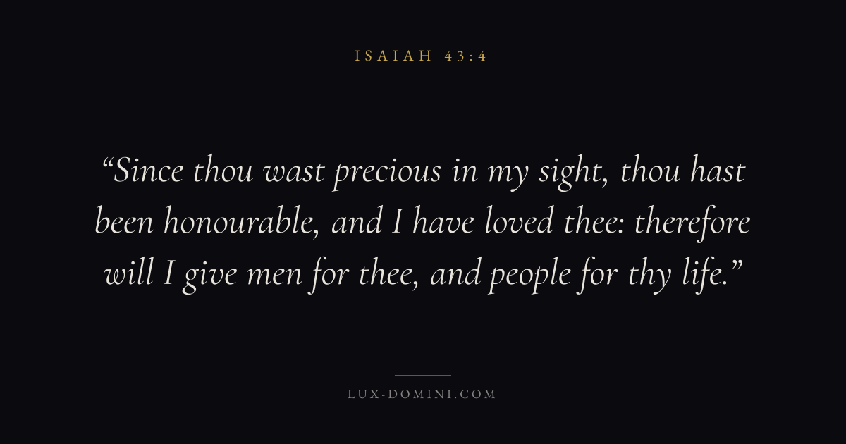 Since thou wast precious in my sight, thou hast been honourable, and I have loved thee: therefore will I give men for thee, and people for thy life.