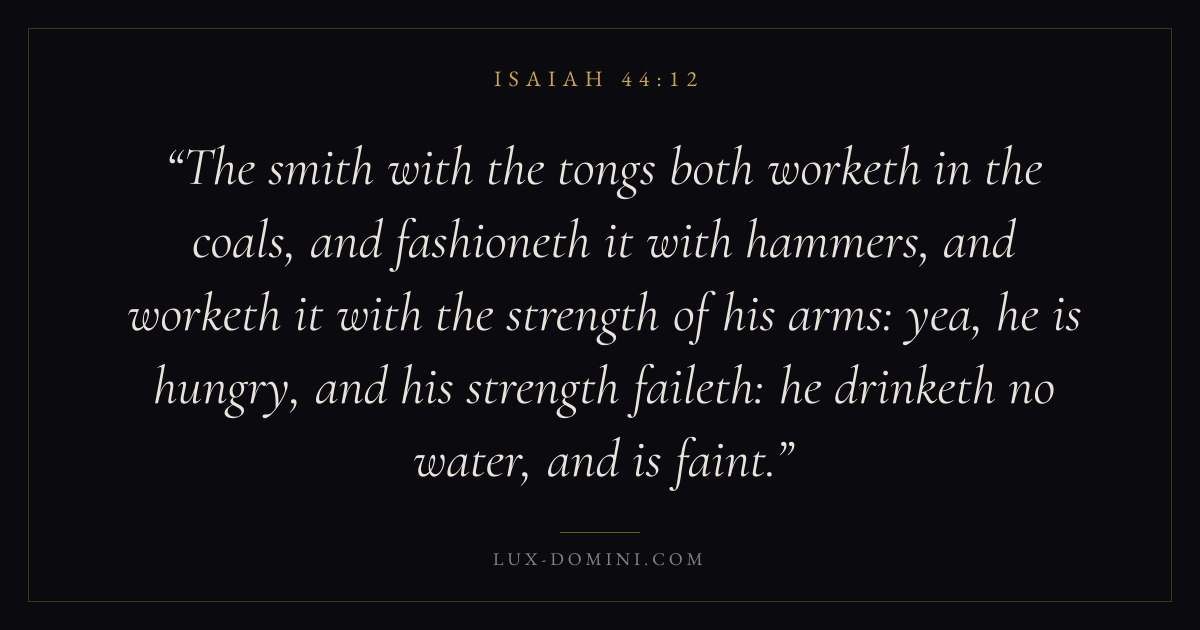 The smith with the tongs both worketh in the coals, and fashioneth it with hammers, and worketh it with the strength of his arms: yea, he is hungry, and his strength faileth: he drinketh no water, and is faint.