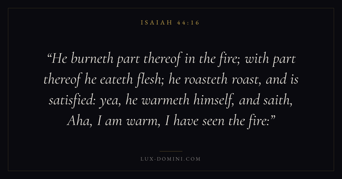 He burneth part thereof in the fire; with part thereof he eateth flesh; he roasteth roast, and is satisfied: yea, he warmeth himself, and saith, Aha, I am warm, I have seen the fire: