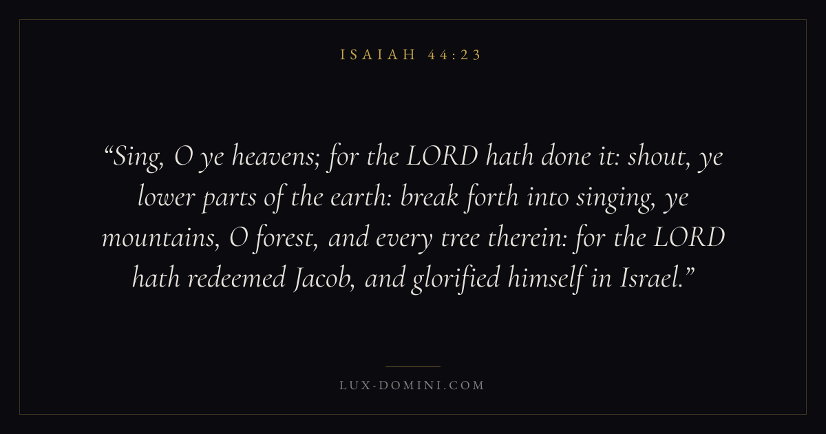 Sing, O ye heavens; for the LORD hath done it: shout, ye lower parts of the earth: break forth into singing, ye mountains, O forest, and every tree therein: for the LORD hath redeemed Jacob, and glorified himself in Israel.