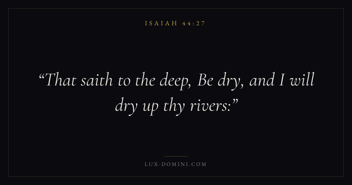 Books / Isaiah / Chapter 44 / Verse 27 ← Isaiah 44:26 Isaiah 44:27 Isaiah 44:28 → That saith to the deep, Be dry, and I will dry up thy rivers: Download verse card Share on Twitter Share on Facebook Pin it ✦ Key themes Justice and mercyHolinessJudgmentRemnant Read with Isaiah 44:24Isaiah 44:25Micah 6:8Amos 5:24 Related topics Bible verses about justice and mercy ✦ Isaiah Chapter 44 verses V. 1 V. 2 V. 3 V. 4 V. 5 V. 6 V. 7 V. 8 V. 9 V. 10 V. 11 V. 12 V. 13 V. 14 V. 15 V. 16 V. 17 V. 18 V. 19 V. 20 V. 21 V. 22 V. 23 V. 24 V. 25 V. 26 V. 27 V. 28